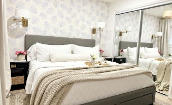 Bedroom has a King Size Bed with pull out drawers, 12ā Memory foam Mattress, 4 King Bamboo Pillows, Vintage Faux Bamboo Hand-painted Nightstands from my Furniture Shop, Luxury Quilt, Double Mirrored Closet with Extra Hangers, Large Swing Brass Sconces, Privacy Blinds and Darkening Drapes, Large 6 Drawer Dresser and additional 4 Drawer Hand-painted Faux Bamboo Dresser in closet.