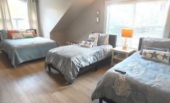 All 5 bedrooms have attached ensuites providing convenience and privacy. Most bedrooms also have their own workspace and Smart Roku TVs. The kitchen is well equipped with cookware, glass wares, spices and more. There are 1 refrigerator in the kitchen and another refrigerator off the kitchen in the laundry space. The outdoor porch has a BULL BBQ with two beverage refrigerators and a Smart Roku TV. Access the private swimming pool off of the Carolina porch with 4 lounge chairs for sunning. There are multiple seating areas on the Carolina porch for dining and socializing.