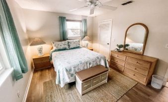• A guest bedroom with a queen bed, 40” Roku TV, and closet