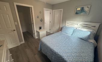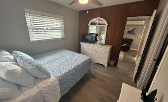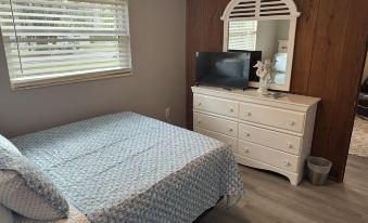 The bedroom has a queen size bed with fresh clean linens, a full size dresser and mirror. The bathroom has a shower/ bath and comes stocked with 2 sets of towels, hand towels, and wash clothes.