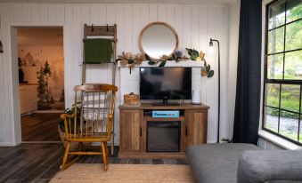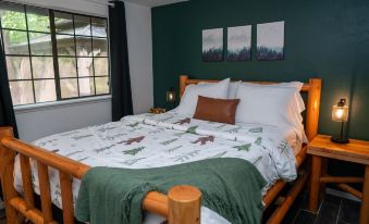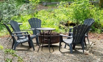 Enjoy a good book by the creek at the fire table, or fireplace inside, & explore nearby water features. Capture memories with a selfie by our Bigfoot mural in the kitchen or the outdoor Bigfoot, & share the joy using #BigfootBungalow across your social media!