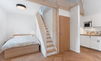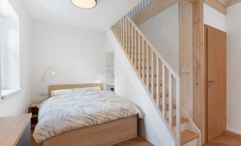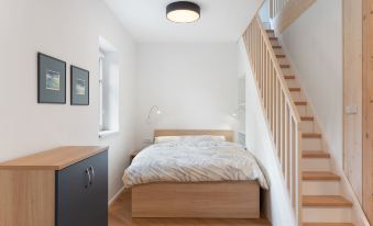 Mezná: Child friendly, modern, cosy residence "V kapradí", 3 storeys, built in 2025, surrounded by trees. 4 apartments in the property. In a quiet, sunny, elevated position, 600 m from the river, in the countryside. For shared use: property 1'000 m2. Patio, garden furniture, barbecue, children's playground (slide, sandbox). In the house: WiFi, central heating system, burglar alarm system. Storeroom available. Parking (for 6 cars) at the house, public parking 200 m on the road. Shop 2 km, grocery 2 km, supermarket 5 km, restaurant 400 m, bicycle rental 5 km, bus stop "Hřensko, Mezná" 500 m, thermal baths "Bad Schandau" 18 km. Golf course (9 hole) 6 km, cross country ski track 6 km. Nearby attractions: Soutěsky Hřensko 1,8 km, Pravčická Brána 2 km, Skalní hrad Šaunštějn 5 km, Dolský Mlýn 7 km, Jetřichovické vyhlídky 10 km, Skalní hrad Falkenštejn 10 km, Bad Schandau (D) 16 km, Adrenalin park Jedlová 27 km. 2-room Loft on 2 levels on 1st floor. Very beautiful furnishings: open large living/sleeping room with 1 double sofabed (140 cm), 1 double bed and TV. Kitchenette (oven, dishwasher, 4 ceramic glass hob hotplates, kettle, microwave, electric coffee machine) with dining nook. Shower/WC. Upper floor: gallery with 1 double bed. Beautiful view of the garden and the forest. Facilities: hair dryer. Internet (WiFi, free). Parking. Suitable for families. Maximum 2 pets/ dogs allowed. Instead of an enclosed bedroom, some sleeping areas are located in an open-plan area (gallery, alcove, etc.).