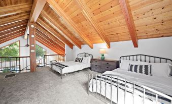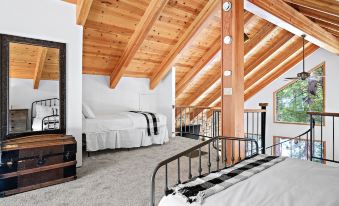Inside you will find high ceilings and windows that show off the beautiful scenery and create plenty of light. The downstairs features open architecture that A-frame cabins are known for and include a gas stove, chef’s kitchen, and wine fridge for making unforgettable meals. Our favorite spot in the cabin is a cozy reading nook that sits next to the wood-burning fireplace and looks out onto the creek. You’ll often see deer outside sipping from the creek or running through the snow.