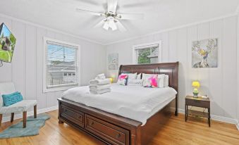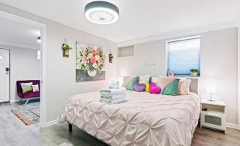 This unique and beautiful 2-story, fenced single-family home boasts 5 bedrooms, 2 fully equipped kitchens, and exclusive parking for up to 5 cars, including a detached parking garage for a mid-sized car/SUV. Enjoy a keyless entry and a welcoming porch with rocking chairs. The living room features a wall-mounted 65-inch LG smart TV and opens to 4 bedrooms upstairs and 1 bedroom downstairs, including a master suite on each floor. The home sleeps up to 10-12 adults with the option to add an air mattress. All 5 bedrooms come with high-end mattresses, including Nectar and Euro-top, and most of them smart TVs with Netflix, Amazon Prime, and Disney subscriptions. 2 Full bath including a beautiful luxurious bath downstairs which has a beautiful Walk in shower and 2 people jetted bathtub. The 4th bedroom upstairs opens into a spacious fenced private backyard, with a good size deck. The lower level has a beautiful romantic themed downstairs bedroom with lights for ambience and 43 in LG TV. Large open living room with kitchen downstairs and good place to entertain a large group. There is another room downstairs which has a futon/sofa and can sleep 1 person. There's also a spacious backyard with a deck, grill, and outdoor dining. A flexible check-in and checkout time is available based on availability. Experience luxury and comfort in the heart of Broad Ripple, just 10 minutes from nightlife, restaurants, and shopping centers.
