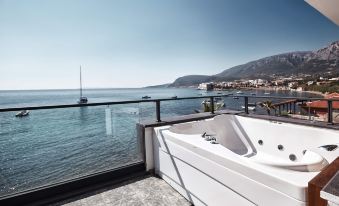 There was a bit of confusion when we checked in. We booked the duplex suite but they brought us to a normal room. After we said something about that, we were brought to a duplex suite. We thought our room would have sea view but that was not the case. Only the honeymoon suite has sea view. But we liked our room very much. It was clean and spacious, the bed is comfortable. The hotel looks great and the bay is beautiful. Staff is very helpful and the owner often checks in with us. Breakfast is good with variation and you can always ask for your favorite items as extra. We had lunch there twice and that was also good, delicious mezzes! Sunbeds are comfortable and the view is priceless. I would definitely recommend this hotel and would come again. Nevertheless I have a few remarks: cleaning is every other day and I think this should be daily in such a high standard hotel. Also because you cannot flush toilet paper but use the bin for that. They do not offer complementary water daily in the room which I think is normal in a hotel like this. They also do not have pool towels which should be normal in a hotel by the sea. But again, I would love to come back!