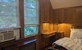 Three 3 simply-appointed private bedrooms including queen, full and full. Each room has overhead lights, work space, large windows, classic closets and gable-sloped ceilings. The bathroom is new: heated, tiled and well-appointed with towel bars, door hooks and natural light.