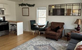 Centrally, located between Lake Placid & Plattsburgh, NY in the heart of Au Sable Forks on the main road to Wilmington (White Face), & Lake Placid. We’re directly on the East branch of the Au Sable River & walking distance to many things. Including, a shuttle to Lake Placid/Whiteface. Unit 3 is located on the second floor and has 2 large, beautifully decorated bedrooms with views of the AuSable River. Bedroom 1 has a queen bed & bedroom 2 has a full size bed with a twin trundle. The open concept kitchen-living room features stainless steel appliances, butcher block countertops with bar seating, a large pantry with complimentary coffee & tea, a microwave & toaster oven. As well as tons of storage for additional food. The living room area has a 60” smart TV for all your streaming Apps. Each unit has shared access to the yard, which faces the river and features outdoor seating and a fire pit. Firewood, will be provided for your convenience. From the yard you can take the short path down the bank to access the river. This building was originally constructed in the 1900’s & still has some of it’s original charm but has been recently updated.