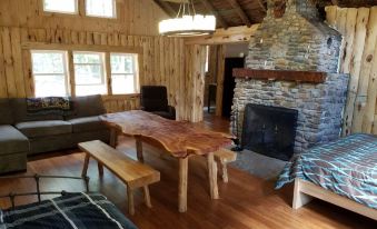 This a very special cabin built by a master craftsman with logs from our property. It has cathedral ceilings, ceiling fans and AC. It has normal heating system and a wonderful stone fireplace for pleasure. The cabin comes will all the modern amenities. There is WiFi. There is a swimming pond and paddle boat just steps outside the cabin. There is a fire pit. There is a charcoal barbecue grill The cabin is an open great room with a Queen bed, a Queen sofa bed and a day bed that opens into two twin beds. The cabin is great for a couple or a family of 4.