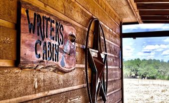 The Writer’s Cabin is a rustic retreat with all the amenities you could ever need. It is situated on our small farm on the west edge of Johnson City, a 1 1/2 minute drive from the town square. We have 2 donkeys, lots of chickens and guineas, 2 of the friendliest dogs ever, and a couple of adorable cats to keep you entertained. The yard is full of huge live oak trees, and comfortable seating areas. We offer a full breakfast with farm fresh eggs if you care to join us. We also have two bedrooms in our Farmhouse (across the driveway) available for reservation. The Private Suite sleeps 4 and the King Room sleeps two.About pets:No pets allowed.About checkOut:Check out before 12:00 PM.About children:Adults only.About customRules:Turn off all outside lights when you are in for the night..Strip bed and put sheets and towels in box in bathroom. Take out the trash to the dumpster near the parking spot..About checkIn:Check in after 3:00 PM.About smoking:Smoking allowed: in designated areas.About minBookingAge:Minimum age to rent: 21.About events:Events allowed: family gatherings, birthday parties, weddings.Maximum event attendees: 30.