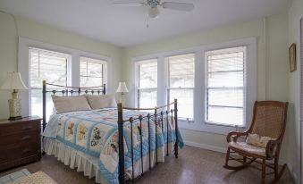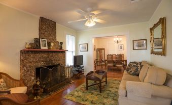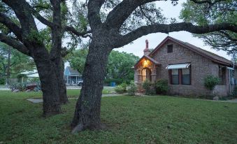 This historic cottage was once home to Sam Houston Johnson, brother of Lynden Baines Johnson, 36th President of the United States. Distinctly appointed with country chic furnishings, you will find a luxurious king size bed in the master bedroom and a full size bed inthe second bedroom. The kitchen is fully stocked with everything you will need; there is a coffee maker and a microwave. The dining room displays LBJ memorabilia and photos and has a large dinnig table with seating for up to 6. The living room has a stone stacked, wood