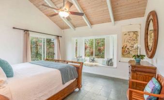 Tee off at Makai Golf Club, or snorkel and sunbathe at several secluded beaches dotting the North Shore. Hanalei Beach offers a long strip of sand with stunning mountain views. The perfect home-base after a long day of exploring the islands mountains, rivers, and beaches.