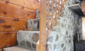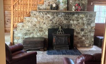 Family Room / Den – The warm heart of the cabin, featuring a wood-burning fireplace, extra-large forest-view windows, and access to the front door. The fireplace’s unique structure doubles as stairs to the bunk room above.