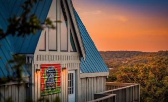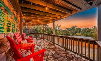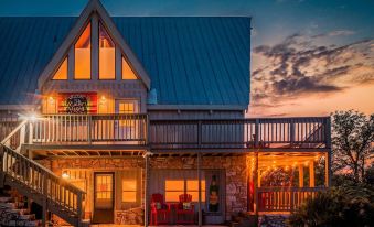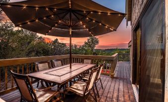 Welcome to Cielo Vista! This unique A-framed retreat is nestled high above the canopy with breathtaking views, overlooking the Guadalupe river valley and surrounding tree-covered hills. Floor-to-ceiling windows in great room so you'll never miss a gorgeous sunset. Wrap around decks on both levels are great for catching some rays or sitting under romantic cantina lights under shade by the pool! With 5 bedrooms, 3 baths and 2 kitchens, this place has it all!