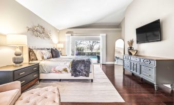 Primary Bedroom: King bed, large flat-screen TV, and sliding glass doors that open to the pool and lakefront dining area. The en-suite bathroom has an open layout with a jetted tub, separate shower, and vibrant jungle-themed wallpaper.