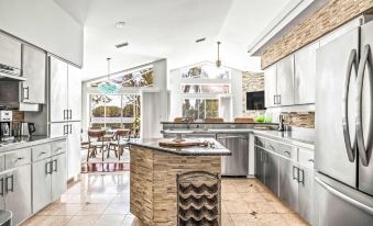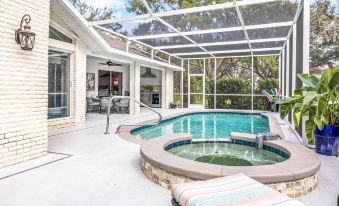 Screened-In Pool & Spa: Pest-free swimming right off the back door, with a connected spa that flows into the pool. Two sun loungers provide space for relaxation, and a third bathroom is conveniently located for swimmers.