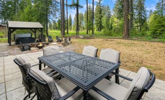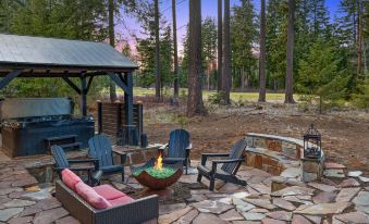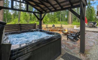 Location! Our home is nestled in the trees right on the golf course, within walking distance to parks, golf courses, and a 5 minute walk to Swiftwater winery / restaurant. Enjoy your stay while in the jacuzzi overlooking the custom oversized fire pit! Fill your time playing pool and/or ping pong in our converted garage game room with TV. Our back patio with a fireplace for your dinner or lunch.