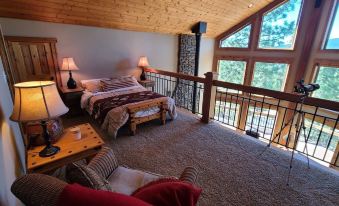 The upstairs loft has a medium-firm full-sized bed and a full bathroom. It also has an even better vantage point of the mountains!