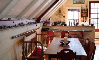 The modern, cozy kitchen will support all of your cooking needs. Plenty of inside dining areas, as well as dining al fresco on the deck, right next to the kitchen. The loft and cupola are private retreats for children in your party, just like sleeping in a tree house! The views from the cupola are panoramic, with a peek of the ocean in the distance (seasonally). There's a private deck off the back offering beautiful views of our gardens, where you can eat dinner and watch the sunset. The gardens and expansive lawn, lead to a small pond where you can sit next to the fire pit and roast marshmallows.