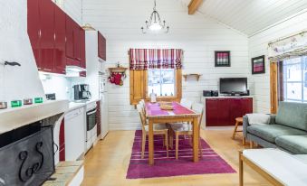 Livingroom/kitchen, two bedrooms (one with a double bed and one with a bunk bed), electric sauna, washing room, terrace, storage room, toilet.