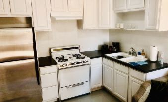 This newly renovated 400 sq ft guest suite has its private entrance and parking separate from the main home on the property. Guests will enjoy the new sparkling studio with bathroom & kitchen stocked with toiletries, plenty of towels, fridge, stove, and microwave. A super cozy living dining space with a 50” Smart TV.