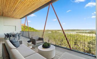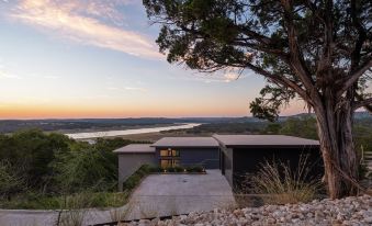 Enjoy nightly lake-view sunsets on Lake Travis in a custom modern environment designed by an award-winning architect. This property is a brand new 2022 construction made to accommodate a large group or multiple families with two equal-sized master bedrooms with king beds, another queen bedroom, and forth bedroom with 2 sets of bunk beds. Private 30' pool and 40' upper terrace positioned strategically to view every breathtaking sunset over the lake.
