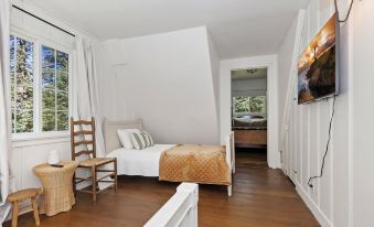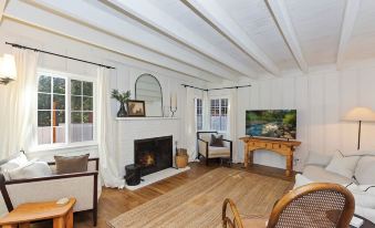 Living Area: The open-concept living room is the heart of the cottage, with a comfortable sofa, a brick fireplace, and windows that bring in plenty of natural light. Enjoy cozy evenings by the fire or a family movie night with the TV and streaming services available.