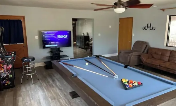 This 3-bedroom cabin is located on a cul-de-sac. It features a full kitchen, dining room, living room with a brand-new billiard table and a "multi-cade" arcade cabinet. It has 2 bedrooms upstairs for up to 10 guests. The master bedroom has its own bathroom with walk in shower, and there is a full bathroom in the hallway. And there is an additional single unit with a full bathroom downstairs for an additional 4 guest.