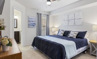 The second bedroom features a king-sized bed, nightstands, dresser, and a bar-height work table.