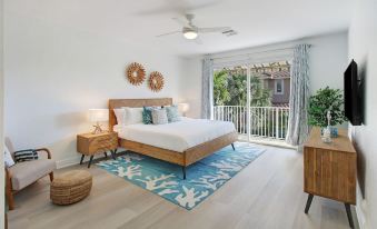 THE MASTER BEDROOM: King bed, flat screen TV, wardrobe, balcony and a bathroom with a shower and tub combination.