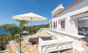 The villa, dating from the Belle Époque and recently completely renovated, is very bright and spacious, with all rooms opening onto the sea and the Îles d'Or. It is ideally located in the heart of the village of Rayol in the Gulf of Saint-Tropez, allowing immediate access to beaches and shops on foot.