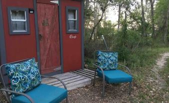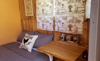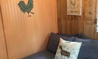 Your own little coop includes a comfy double bed with quality linens, heat, and AC. It sleeps two only or maybe two and an infant/toddler. It is only eight by eight, so no room for more people. The lake is just a short hike from the door.