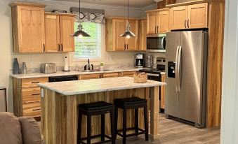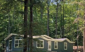 The Blue House is new construction, so everything is clean and new -- you will be impressed (an incredible value since it just recently opened up for rental). Over 1330 s.f. with 2 bedrooms (plus an office/den and laundry room) and 2 full bathrooms. Both bedrooms have queen beds (brand new mattresses and bedding). The highlight of the Blue House is the spacious open concept kitchen, dining and living area. The large living room with fireplace and 50" smart TV is amazing, as is the huge kitchen and dining area (with lovely views of the woods from the large windows and sliding glass doors). Central AC and heat to ensure you are always comfortable, and a new washer and dryer in the laundry room. The kitchen is very well stocked with just about anything you need. The beautiful outdoor areas is wooded and private (you are nestled into a forest of maples, birches and cedars). An outdoor fire pit, patio dining area, and a gas bbq grill ensure you can enjoy the birds and trees in your own private outdoor paradise.