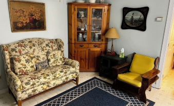 Cottage has a combined living room and kitchen. Door from living space opens to a lovely bedroom with a comfortable queen bed, closet, night stands, and dresser.