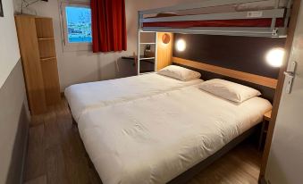 Stayed here for a night en route from Calais to Brittany. Decided to break the journey up a bit. Excellent accommodation in a very handy location. Spotlessly clean. Each room consists of a double or twin bed with a single bunk overhead. I requested two interconnecting rooms when I booked as we are a family of five. We got rooms 206 and 207 which are interconnecting. Receptionist spoke excellent English and was courteous and helpful. There is a macdonalds over the road with a big children's soft play, so we let the children burn off some energy in there after travelling most of the day. Parking is free. Each room also has a tv and free wifi. Beds very comfortable. Fluffy white towels in each room. En suite bathrooms are caravan style, so a bit on the small side, but very very clean and quite adequate. Nice hot shower and cups and soap provided. Could be improved by having tea and coffee in the rooms, but not the end of the world. Breakfast is available for 4.90 euro for adults, half price for children. Cold self-serve buffet. All in all, an excellent choice and I would definitely book again.