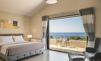 Stairs then lead to the top floor, which houses an entire master suite. An impressive entrance hall leads you to a large and light filled bedroom with a super king size bed and its own en-suite bathroom. The feature patio doors run almost the full length of the wall and open out to the private balcony which wraps externally around the top floor and affords spectacular 270-degree views over the Ionian Sea, surrounding countryside, valleys and mountains. This balcony features private seating for those early morning coffees or a glass of wine at sunset.