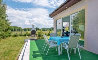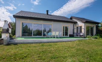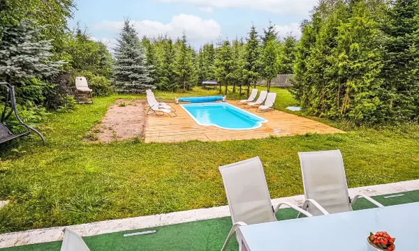 Modern, comfortable single-family house "Butterfly Lux", built in 2019. On the outskirts, in a quiet position, 10 km from the lake, in the countryside. Private: property 6'000 m2 (fenced), swimming pool (25 m2, depth 160 - 160 cm, seasonal availability: 01.May. - 30.Oct.). Table tennis, volleyball, barbecue. In the house: playroom, trampoline, washing machine. Available: bicycles (8). Parking at the house on the premises. E-charging station. Shop 1.5 km, grocery 1.5 km, supermarket 5 km, restaurant 5 km, bus stop 300 m, public bathing area 10 km. Riding stable 5 km, children's playground 200 m. Nearby attractions: Międzyzdroje 90 km. Please note: The owner does not accept any youth groups. Fishing [permit required]. Local sale of farm products. Exclusive private forest. NOTE: Water from a deep well with a specific smell. A fishing permit can be purchased on site in Anielin. There is a children's house in the garden at guests' disposal. Electronic and arcade games room 25 m2 - equipped with ICE HOCKEY, DART, ARCADE KOMP, TABLE FOOTBAL. Our games room is available to our guests. 5-room house 175 m2. Living/dining room with open-hearth fireplace, satellite TV, radio and hi-fi system. 1 room with 1 double bed and TV. 1 room with 2 beds (90 cm, length 200 cm). 1 room with 2 beds (90 cm, length 200 cm). 1 room with 1 x 2 bunk beds (90 cm, length 200 cm). Open kitchen (oven, dishwasher, 4 ceramic glass hob hotplates, microwave, freezer). Bath/WC, shower/WC. Large terrace 45 m2. Deck chairs (4). Facilities: washing machine. Internet (WiFi). Please note: maximum 3 pets/ dogs allowed. Smoke alarm. There is a key box by the entrance door (self-check-in possible). 00