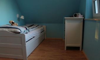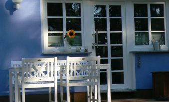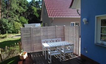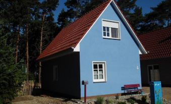 This small blue house is located on the edge of a small holiday settlement in the forest between Kölpinsee and Loddin. The sunsets over the backwaters are wonderful and you can enjoy them on the large terrace. 55 sqm are available on 2 floors: on the ground floor a spacious, modern kitchen and on the top floor 2 bedrooms with a total of 5 beds.