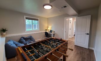 Uber-fast fiber optic internet covers the entire property. Log in to any of your video subscriptions on the smart TV in the living room with comfortable seating. The game room, with a foosball table, dart board, games, and cozy seating, doubles as a secluded work space. A washer, dryer, and laundry supplies are available, as well as a clothes steamer. In the kitchen, a fully stocked coffee bar helps you get ready for a full day enjoying the area. The backyard offers an intimate, fully fenced lawn, patio, dining table for 6, propane grill, and romantic swing bench under a beautiful, mature tree.