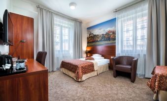 Urokliwy zabytkowy budynek położony pod samym Zamkiem. Wnętrza sa wyremontowane, jest winda. Lokalizacja jest idealna. Obsługa profesjonalna, pokój bardzo czysty i duży jak na jednoosobowy. Łóżko bardzo wygodne, łazienka też duża i czysta. Z minusów - klimatyzacja troche hałasowała, przydałaby sie mała lodóweczka w pokoju, ale w tej cenie to po prostu rewelacja.