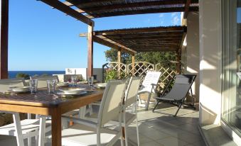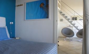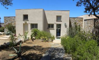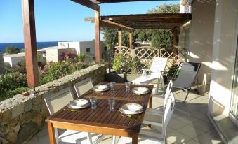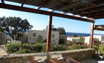Surrounded by the Mediterranean scrub, mini villa composed by a unique ambience open space with fully equipped kitchen corner, living /dining area, two armchairs, and tv; main bedroom with a queen-size bed and bathroom with bidet and shower. On the mezzanine floor (above the living area) there is the second bedroom with a queen-size bed. The mini villa offers also a large covered veranda equipped with a table, chairs, and sunbeds to enjoy sunsets at its best!!!