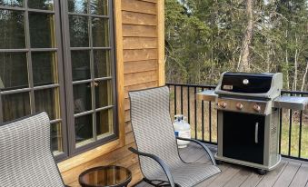 The exterior of the cabin consists of two outdoor living areas - a partially covered wrap around porch accessible from the main living area with gas grill and outdoor dining table for your enjoyment AND a large covered balcony off of the upper level bedroom...perfect for star gazing. The stars are absolutely incredible here! In the quiet of the night, you can even hear the falls....serenity and peace!
