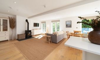 The open-plan kitchen, dining, and living area is offering a bright, modern space with breathtaking mountain views. A wood-burning fire adds a cosy touch, making it the perfect retreat all year round.