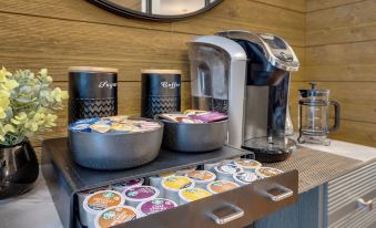 ☀ Coffee Station: Indulge in your coffee ritual with our Keurig, French press, assorted creams and sugars, and a variety of teas and hot beverages.