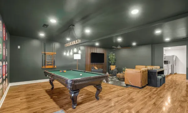 - Massive additional living room with 65” TV, pool table, shuffleboard, and couch/seating area