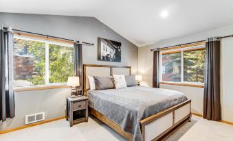 Guests can enjoy an evening out on the deck or sitting around the firepit at this lovely home. In the winter, the wood stove provides plenty of heat that everyone can enjoy. Guests of this home will also have access to a shared seasonal pool, hot tub, gym, and more via the Spring Mountain Ranch HOA.