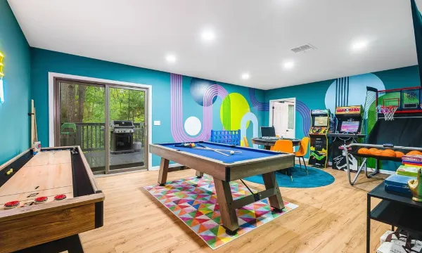 Keep your family and friends entertained throughout your stay in our super fun game room! With a pool table, poker table, arcade games, pop-a-shot basketball, shuffleboard, Giant Connect 4 & a big smart TV, this is the ideal hangout spot to keep you entertained for hours!