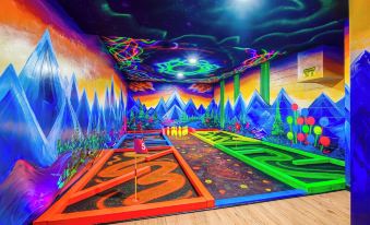 WOW! This is something you have to see to believe. We have a custom indoor mini golf course, with unbelievable murals from floor to ceiling that will make you feel like you are transported into another dimension! Flip on the blacklights to really make this room POP!