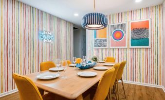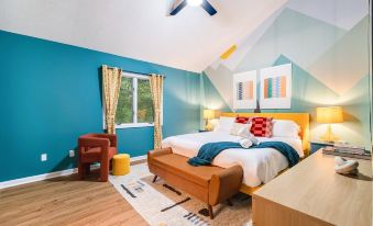 In the living room, you’ll be greeted with high vaulted ceilings, skylights, lots of comfy seating, a big smart TV, electric fireplace, and gorgeous, colorful design along with a massive, fun mural. This is the perfect spot to host your movie nights & games with your friends and family!