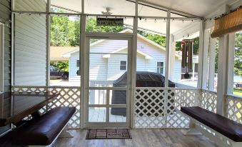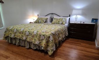 The house has three cozy levels nestled into the bank of the Poplar creek. The road or upper-level contains a five-space parking area connected to the house by a raised walkway. The upper-level entrance is equipped with a smart lock. Covered in bamboo flooring, the upper-level has two bedrooms that share a full bath: the Thunderbolt Room has a king-size bed and a double-size futon; and, the Bowtie Room has a queen-size bed.