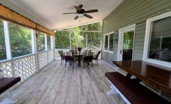 The laminated main or middle-level has an open floor plan with a living room, eat-in kitchen, entertainment area, and full bath. The kitchen is well-equipped with a flat-top stove/oven, dishwasher, microwave, Keurig, coffee grinder, toaster, and refrigerator, and is stocked with plates, bowls, glasses, coffee mugs, silverware, pots, pans, and utensils. The dining table seats eight, and the kitchen has a breakfast bar with seven stools in the entertainment area. The living room and entertainment area are perfect gathering spots and serve as additional sleeping areas with a pull-out queen-size sofa bed. The living room opens up to a large screened-in deck with a ceiling fan where you can relax and enjoy the sunset over the lake. The unscreened portion of the deck has a gas grill and exterior steps which lead to the lake-level and lower parking.